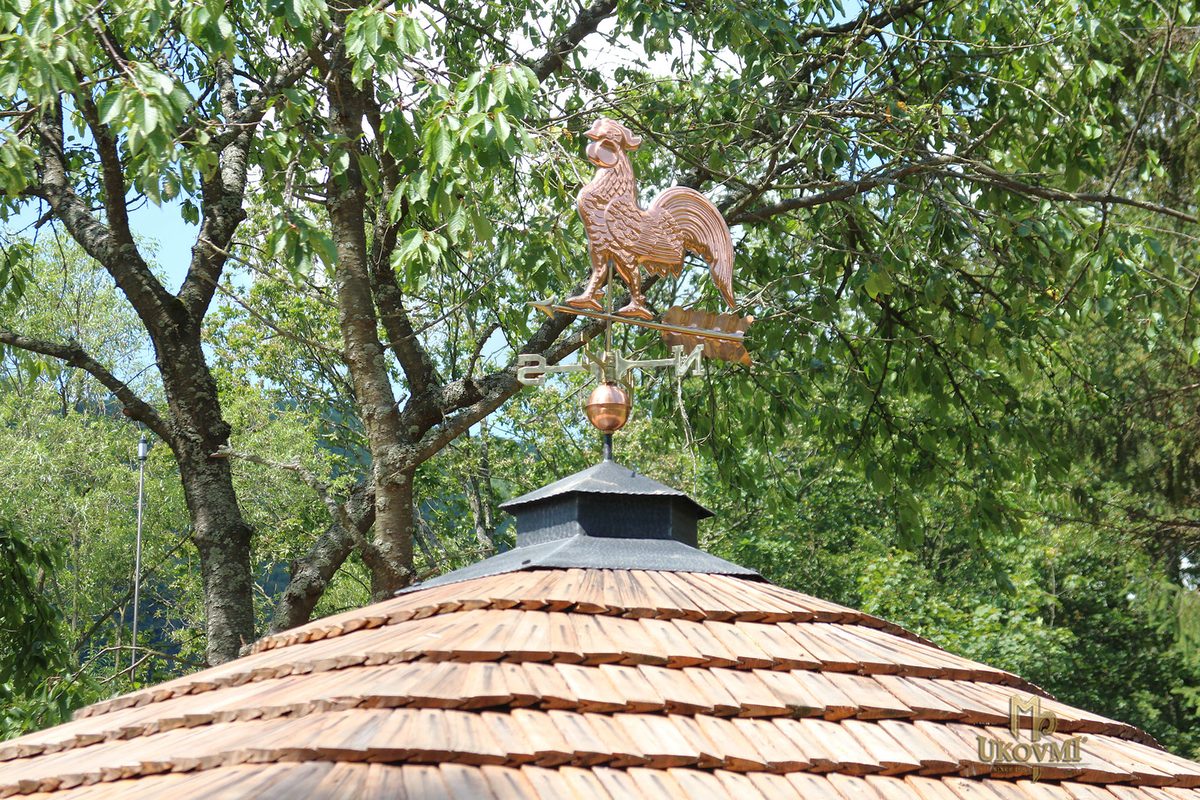 Coq en cuivre sur un toit en fer forgé – kiosque d'été devant une maison individuelle