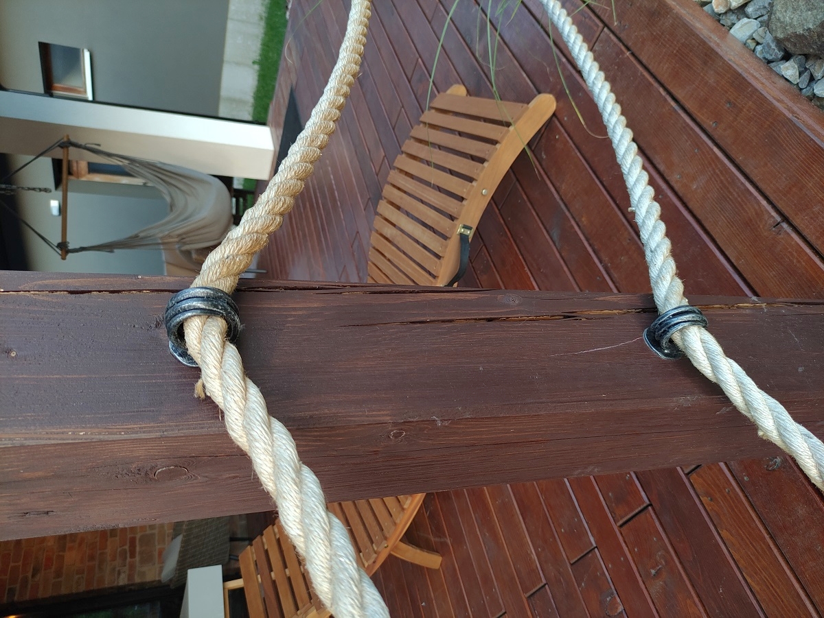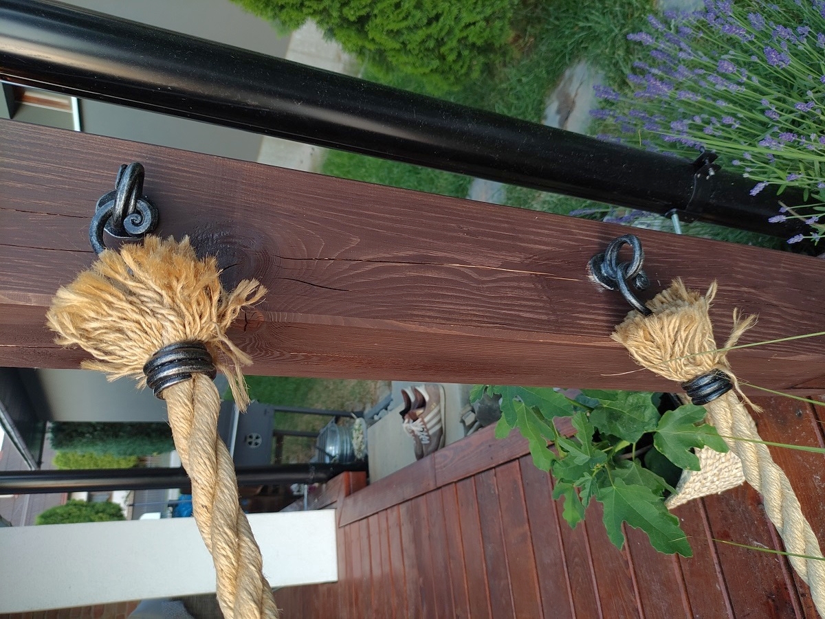 Vue de la terrasse avec balustrade en corde et éclairage forgé de l'atelier de l'artisanat du fer UKOVMI