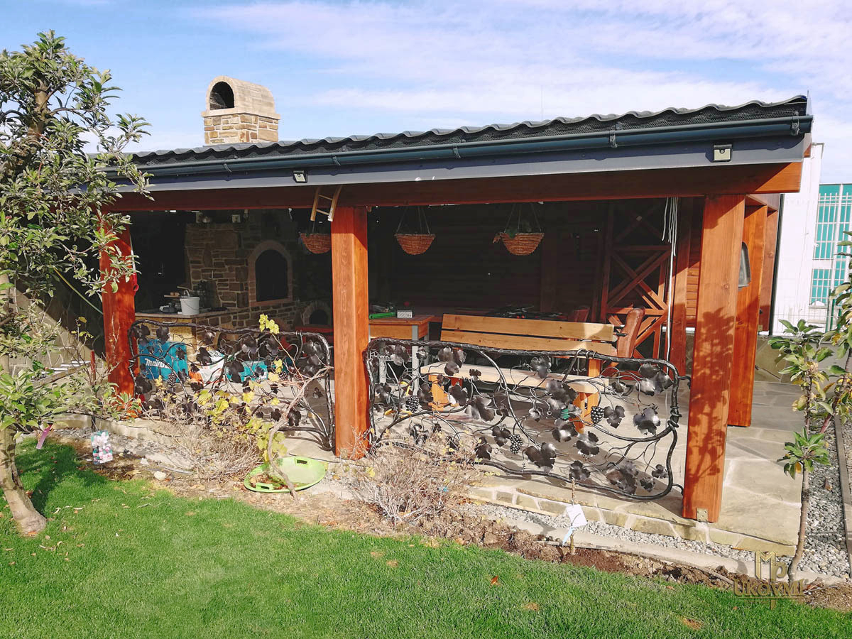 Balustrade extérieure luxueuse avec des pots de fleurs, abri et mobilier de jardin fabriqués sur mesure pour un client