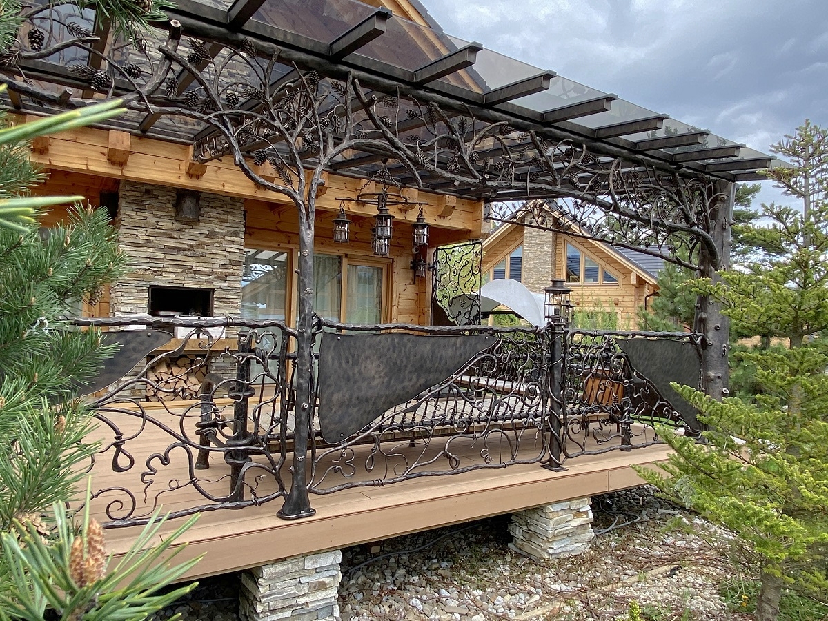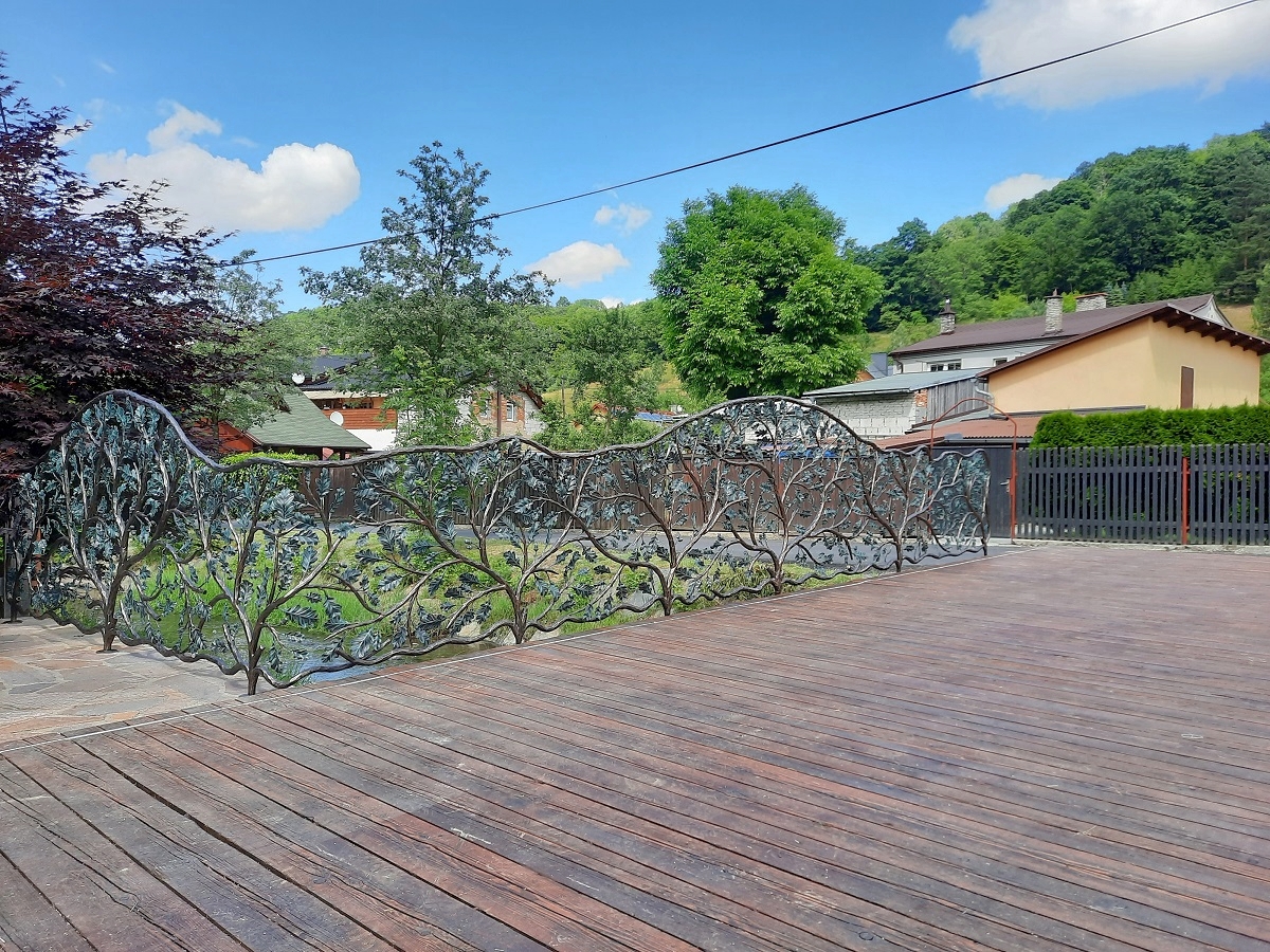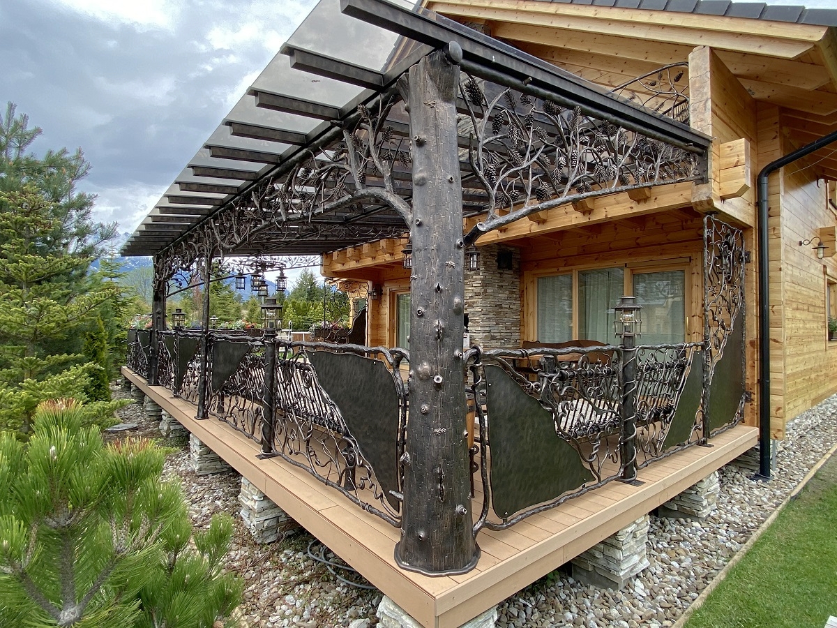 Balustrade artistique forgée avec un motif forestier de pin sur le balcon d'une maison de montagne des Tatras - balustrade extérieure