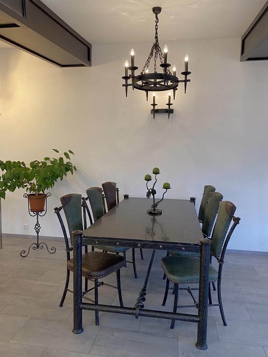 Design pendant lighting and a forged table with wood made in UKOVMI for a family house