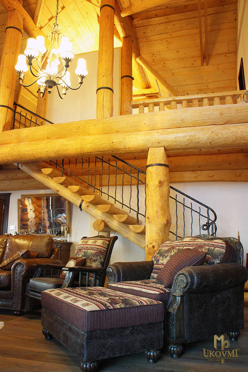 Rampe intérieure forgée dans une cabane en rondins