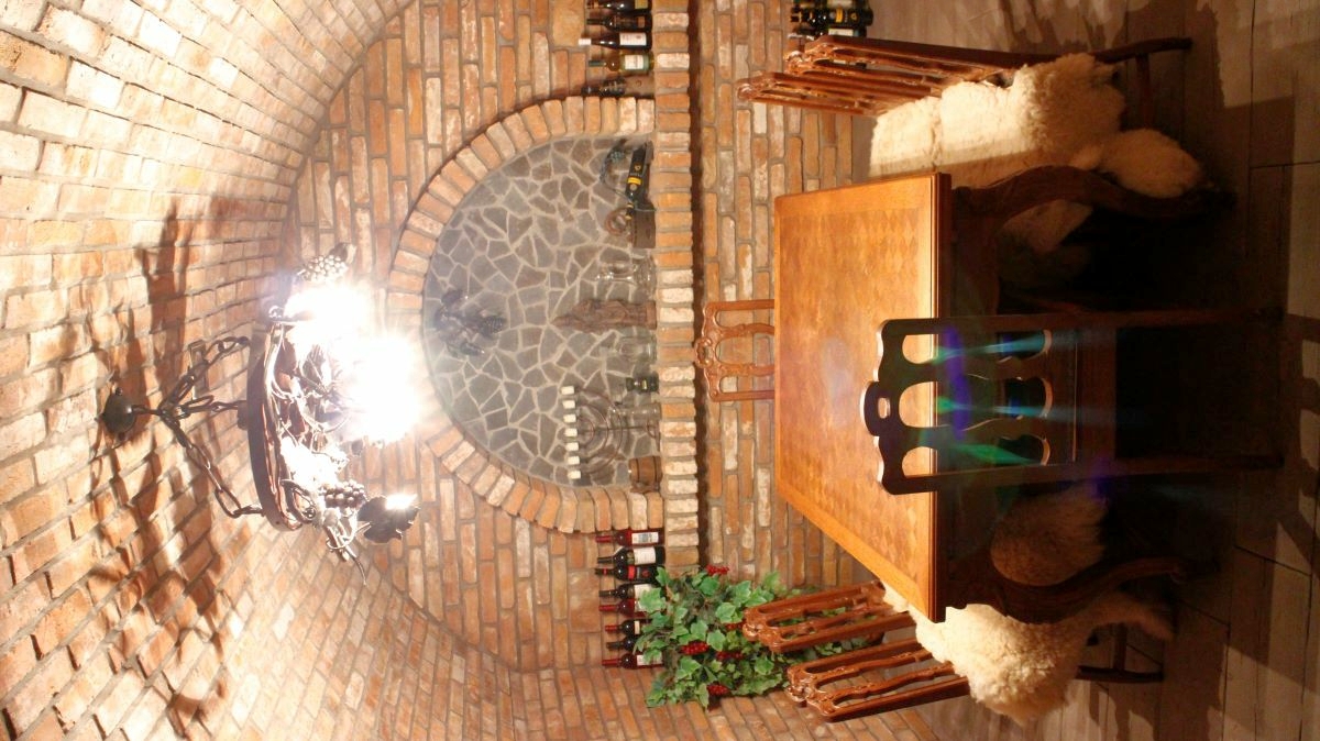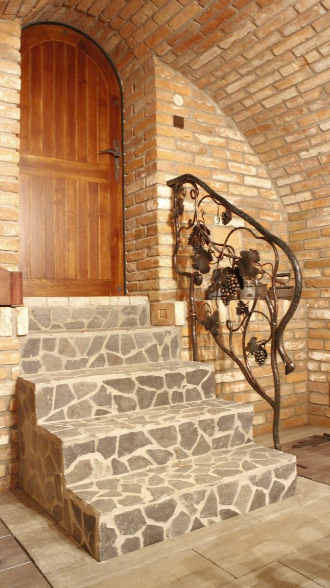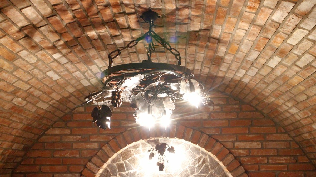 Cave à vin créée avec des éléments de vigne forgés à la main sous forme de garde-corps, d'éclairage et d'autres décorations.