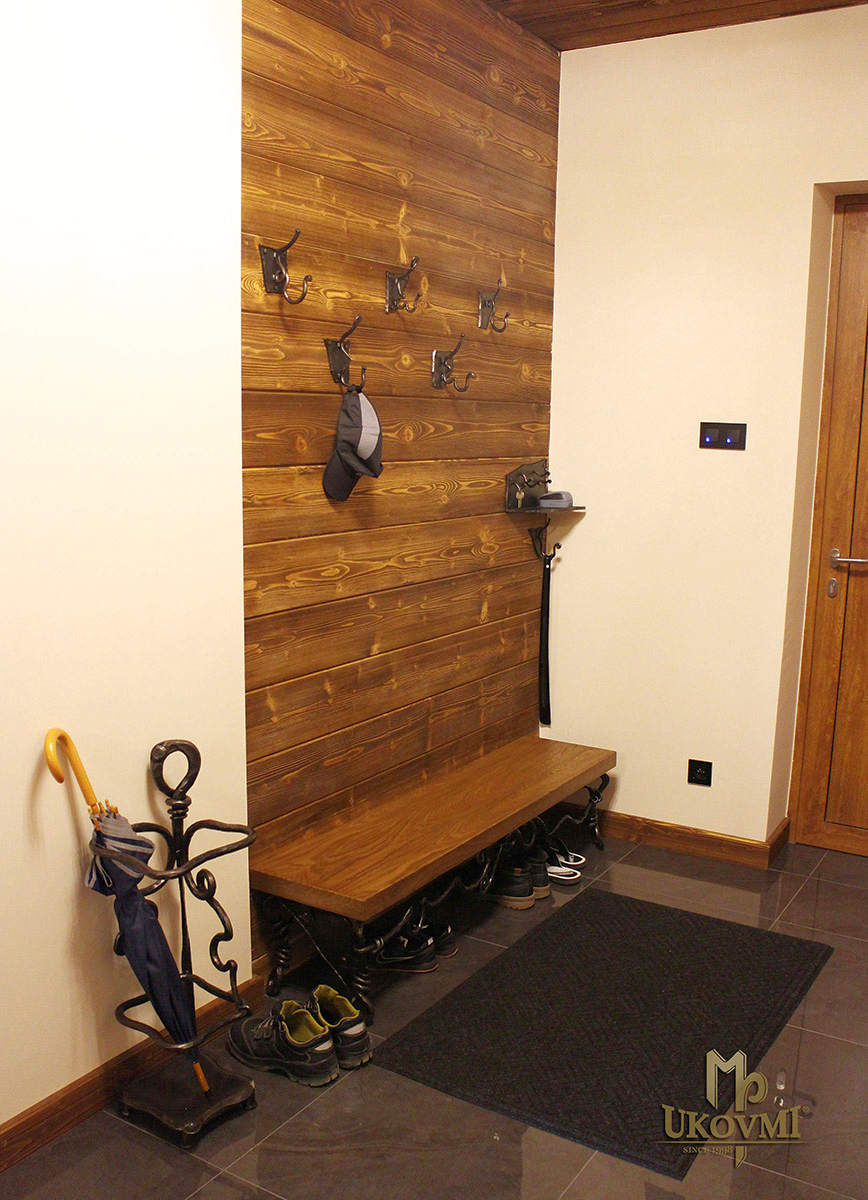 Mobilier de luxe forgé combiné avec du bois dans l'entrée d'un chalet familial