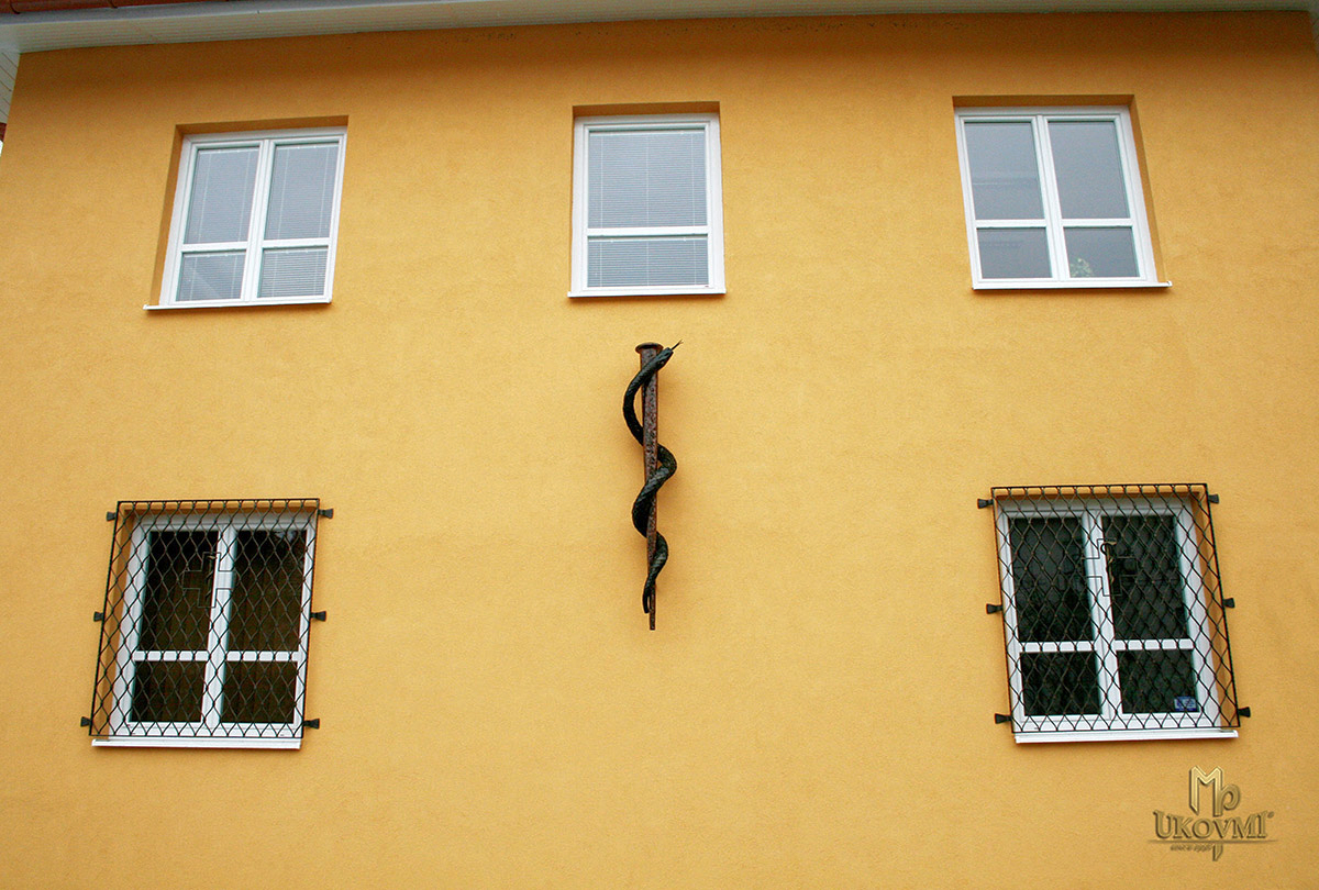Grilles forgées (Vagues) sur la fenêtre avec un serpent au centre - pharmacie.