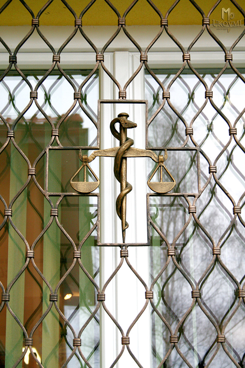 Grilles forgées avec des balances comme symbole de la médecine sur les grilles de fenêtre - détail