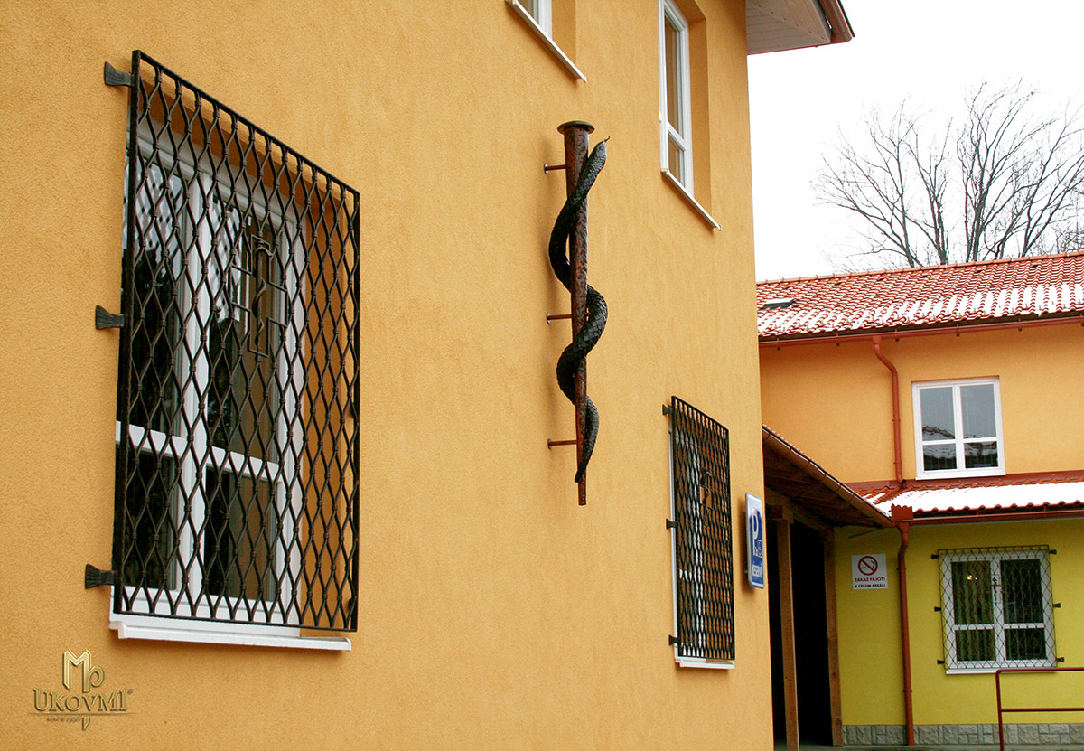 Travaux forgés au centre médical de Levoèa - grilles pour portes, fenêtres et symboles médicaux forgés