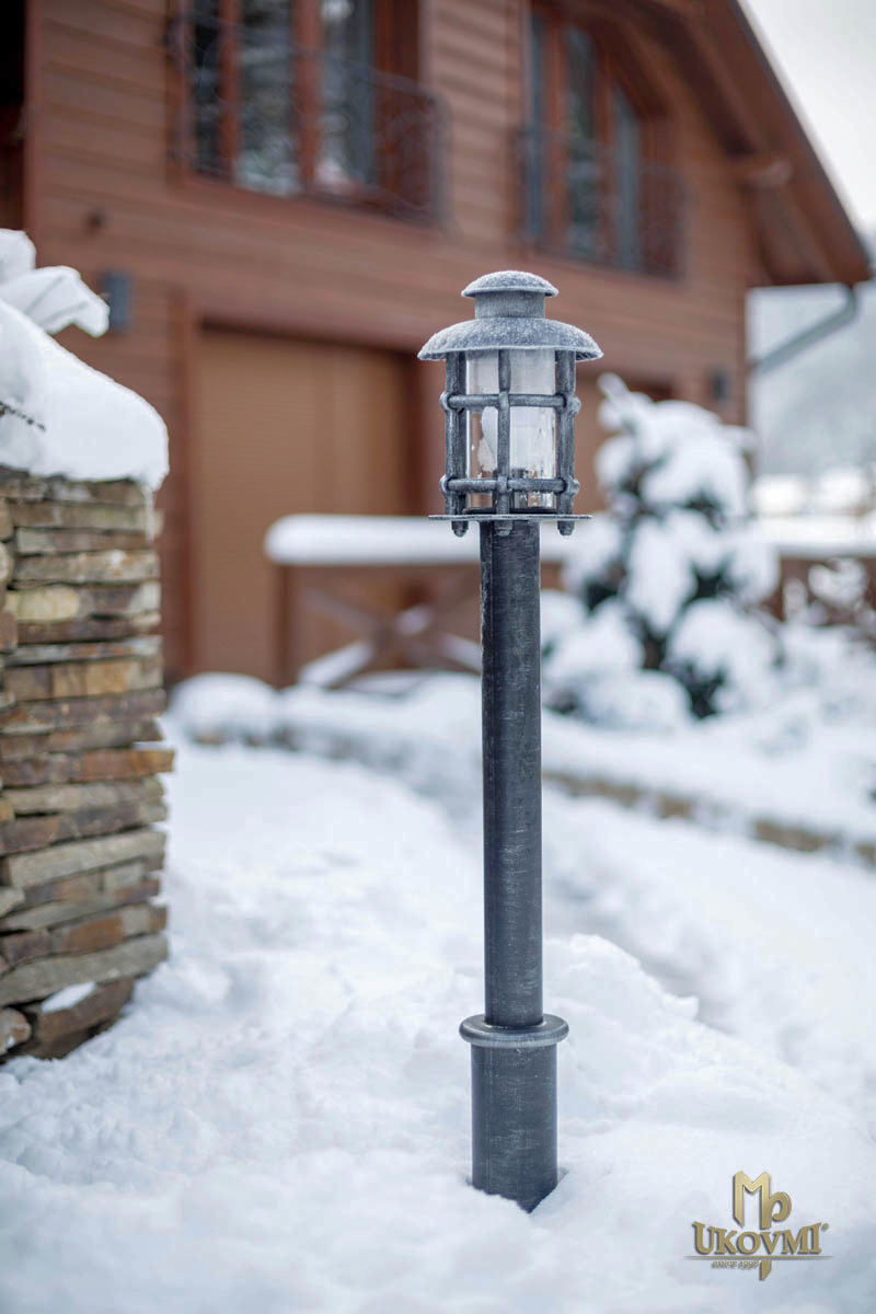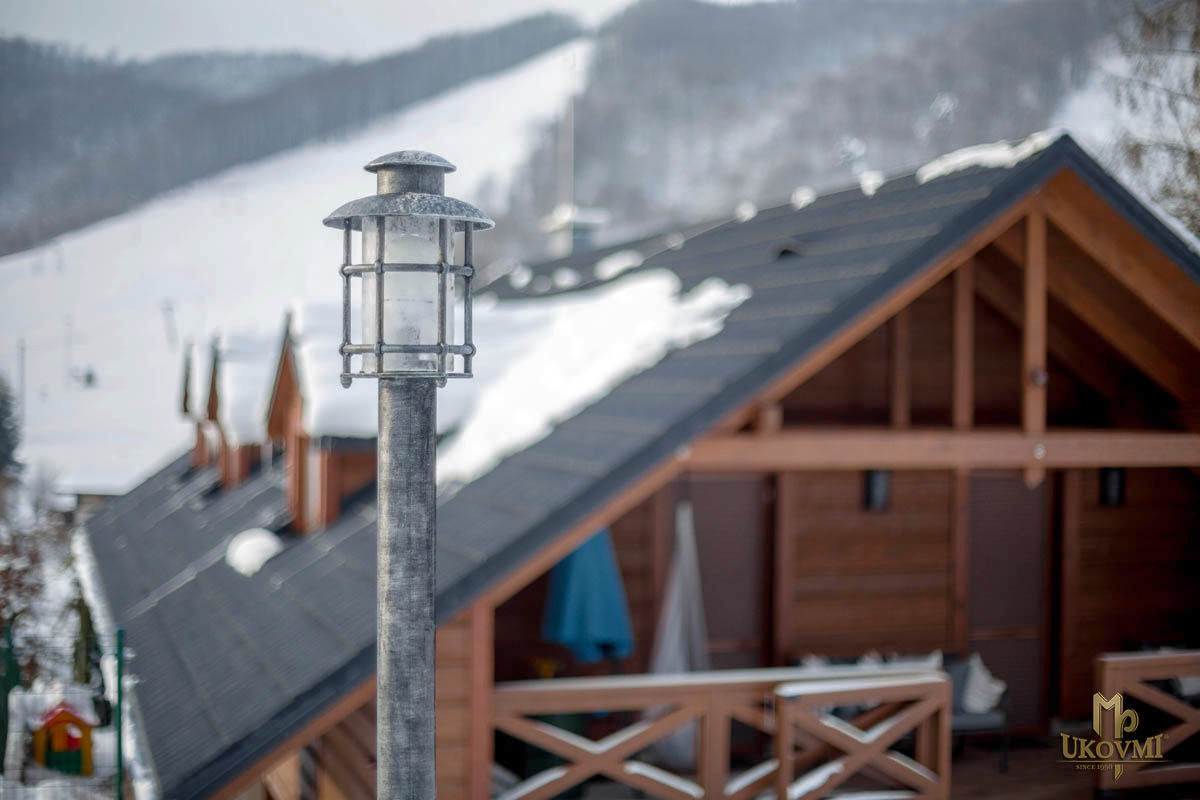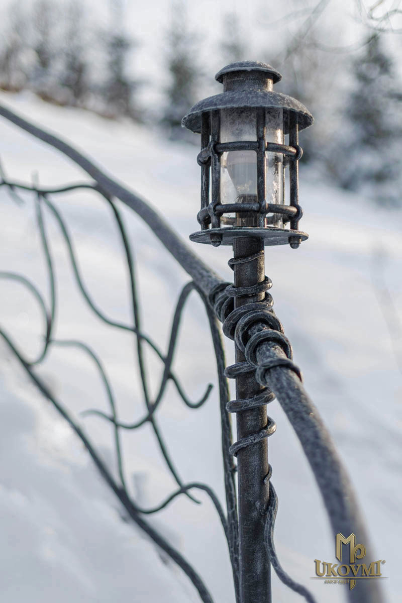 Lampadaire extérieur en fer forgé – luminaire de haute qualité créé par atelier Ukovmi éclairant un chalet de la montagne