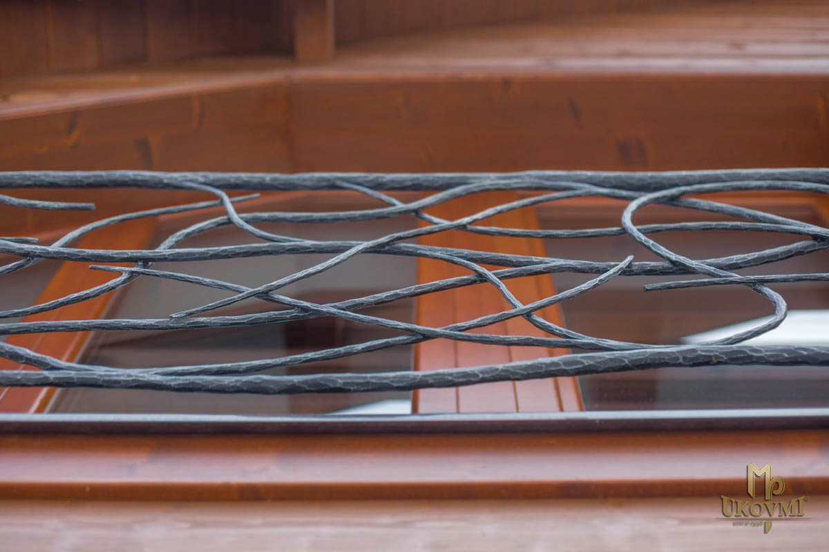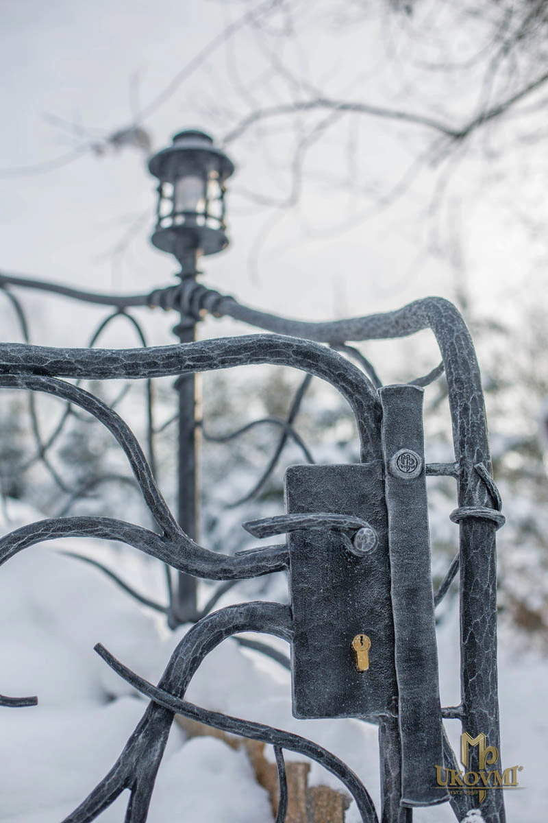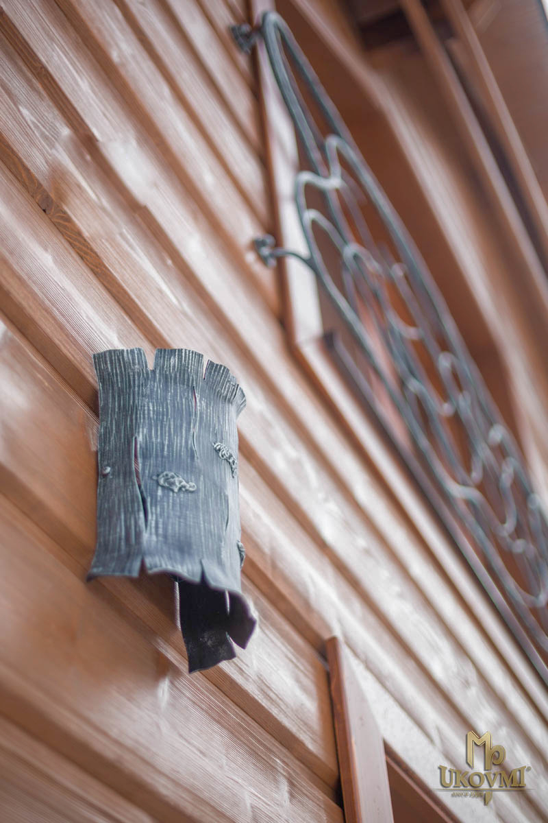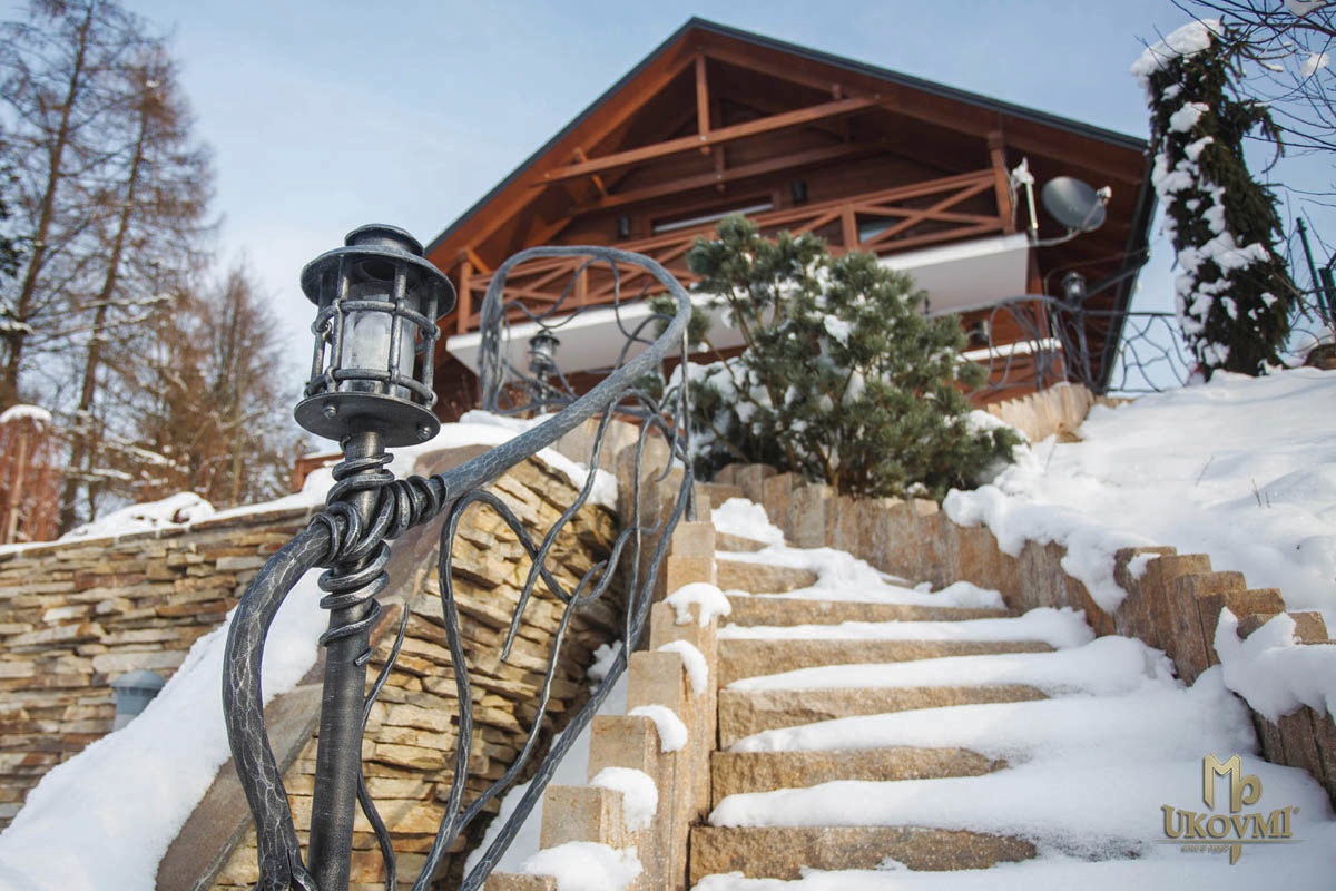 Des œuvres d'art uniques d'UKOVMI sous forme de lampes forgées luxueuses, de balustrades, de meubles, d'accessoires intérieurs et extérieurs (foyer forgé, outils de cheminée, panier en bois...) comme si elles étaient créées pour un chalet près de la forêt.
