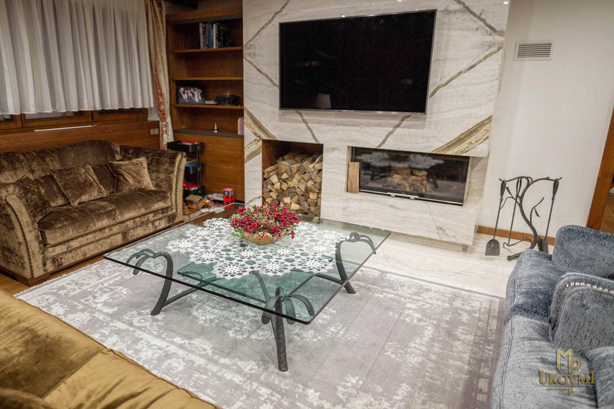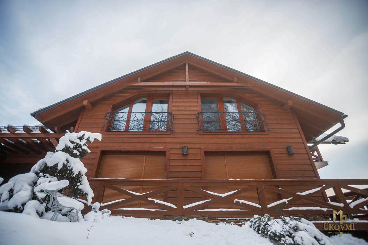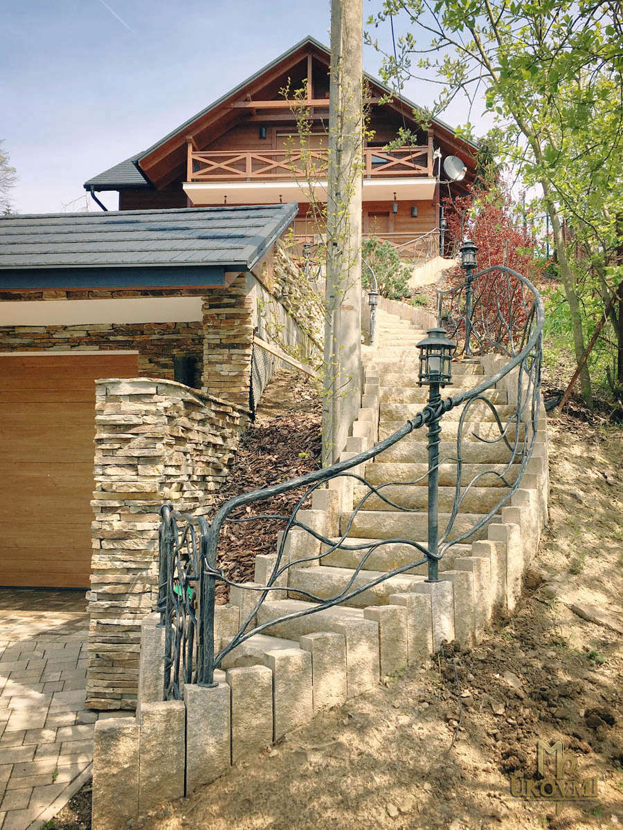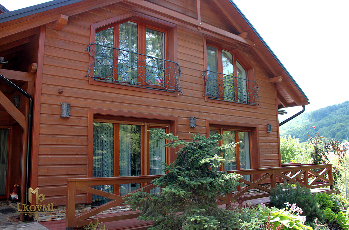 Des œuvres d'art uniques d'UKOVMI sous forme de lampes forgées luxueuses, de balustrades, de meubles, d'accessoires intérieurs et extérieurs (foyer forgé, outils de cheminée, panier en bois...) comme si elles étaient créées pour un chalet près de la forêt.