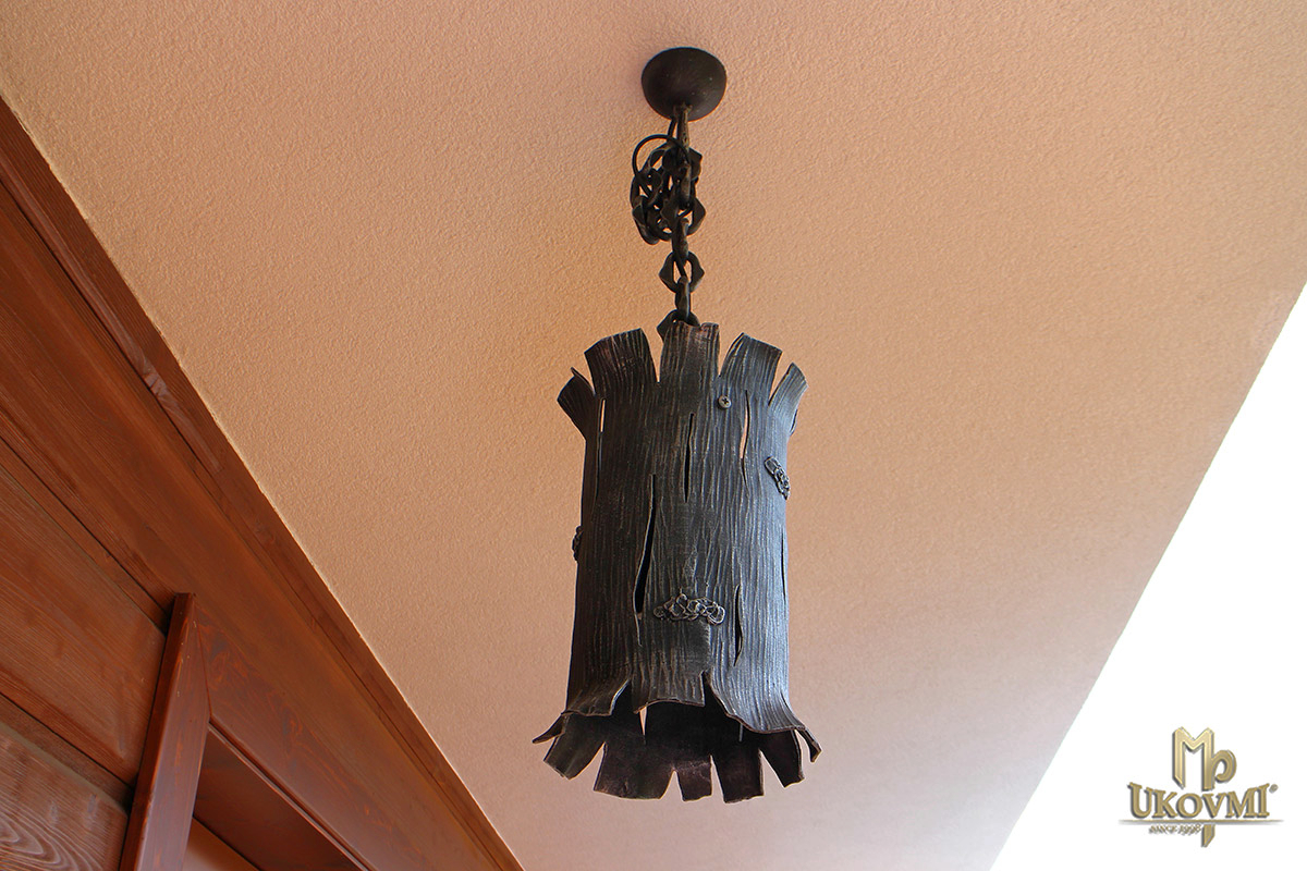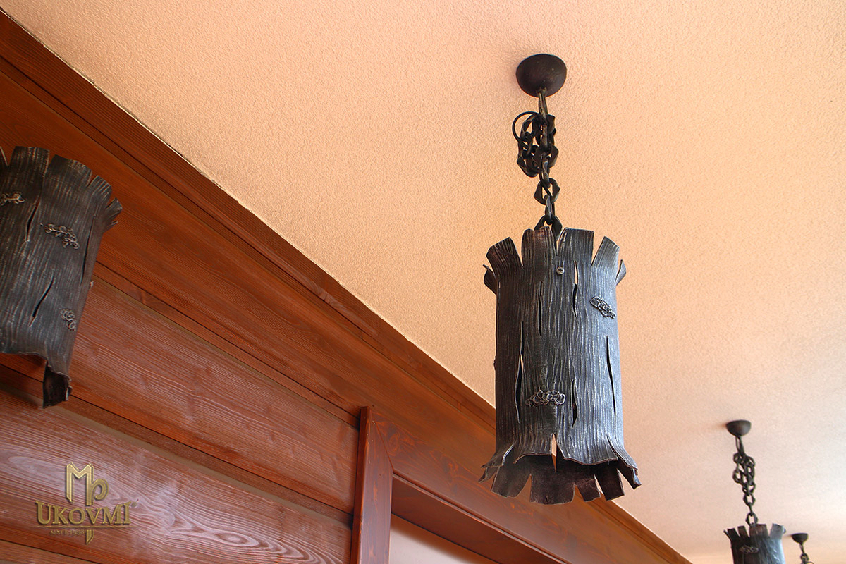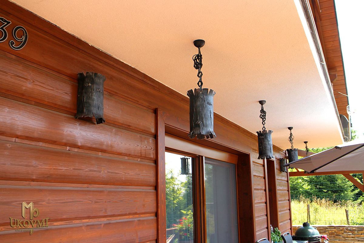 Luminaires originaux aux formes de grume à l’extérieur du chalet – appliques et suspensions en fer forgé