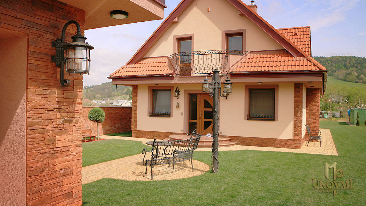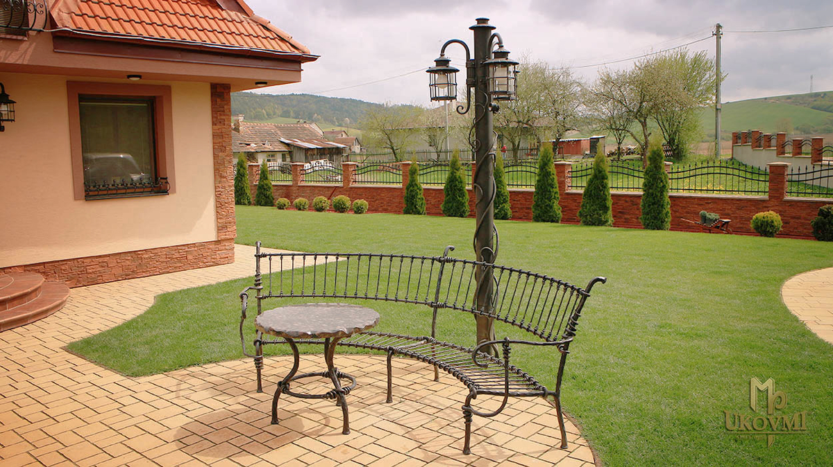 Magnifique harmonie entre la maison familiale et le jardin, avec des luminaires forgés à la main, des bancs de jardin et d'autres créations de l'atelier UKOVMI...
