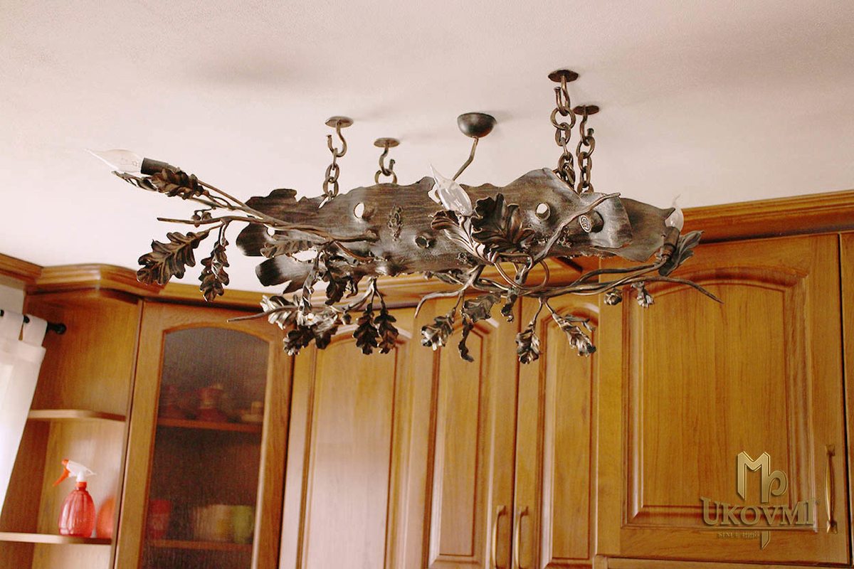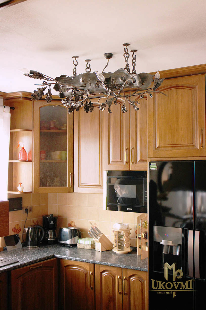 Chandelier artistique dans la cuisine d'une maison familiale - éclairage forgé Chêne