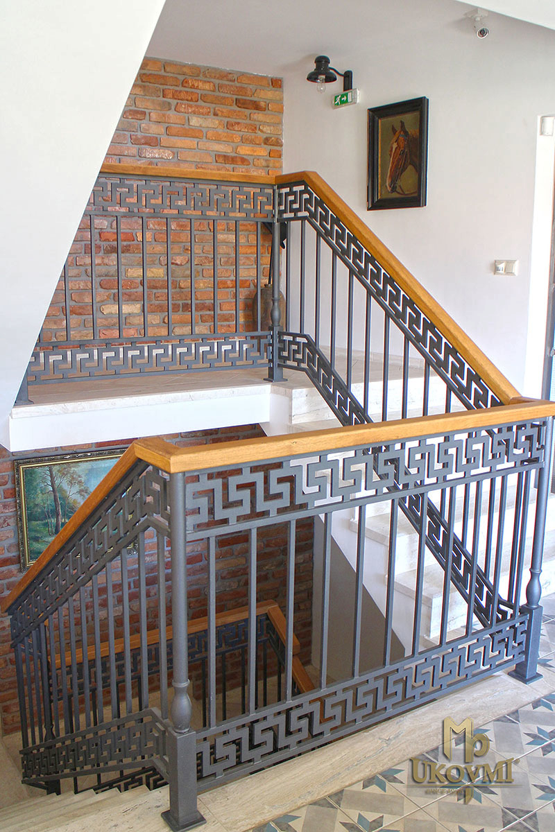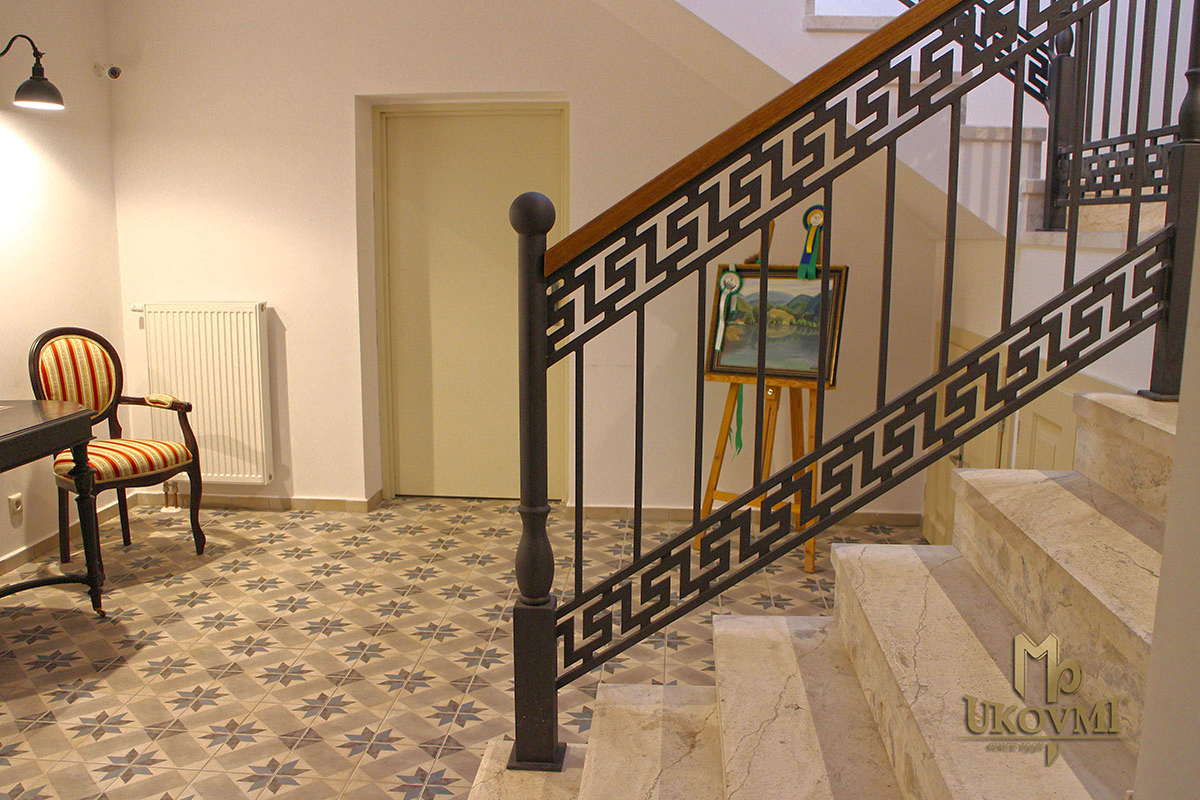Garde-corps antique de l'entreprise Ukovmi sur l'escalier près de l'entrée de la pension