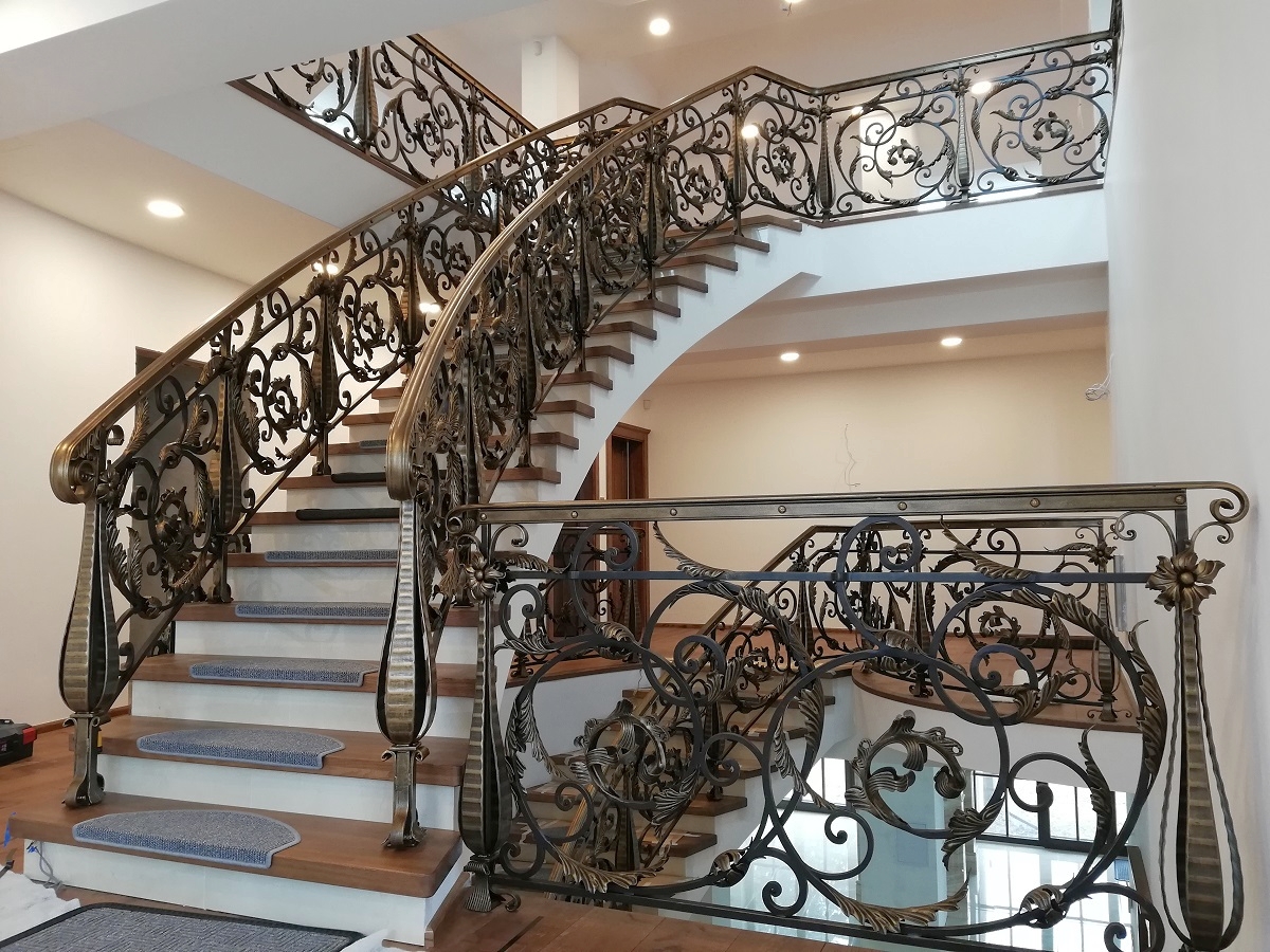 Majestueuses portails en fer forgé et rampes intérieures de luxe dans une villa familiale à plusieurs étages, fabriqués dans l'atelier d'art de la forge UKOVMI.